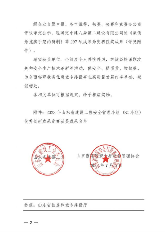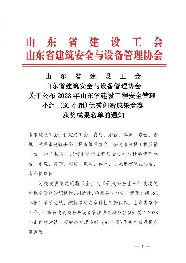 近日,山東省建筑安全與設備管理協會下發《關于公布2023年山東省建設工程安全管理小組(SC小組)優秀創新成果競賽獲獎成果名單的通知》,我市共8項成果獲得2023年山東省建設工程安全管理小組(SC小組)優秀創新成果,其中,一等獎2項,二等獎1項,三等獎5項。