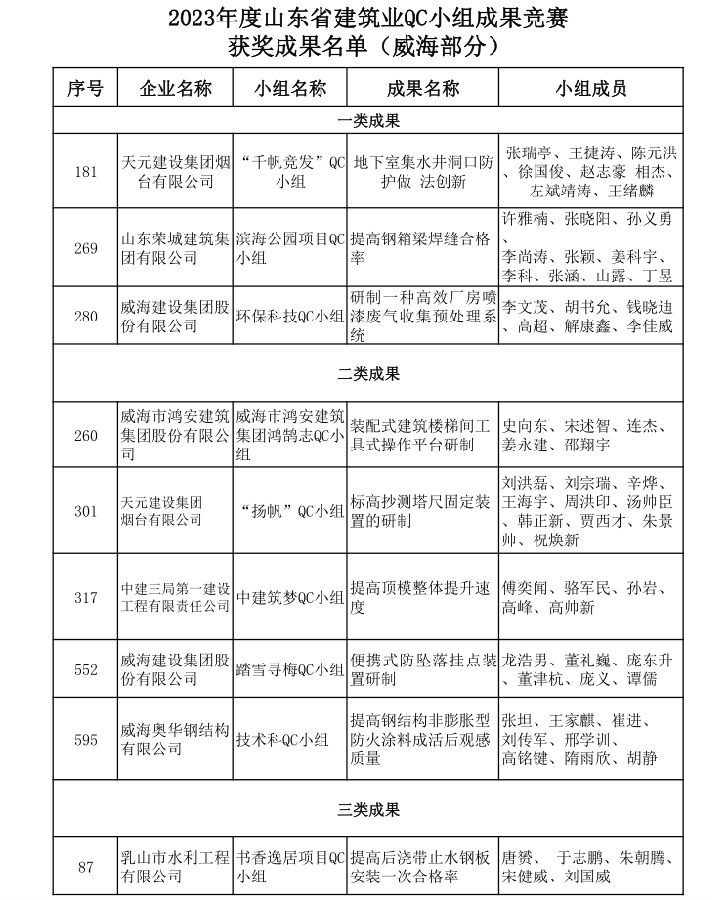 近日,山東省建筑業協會下發《關于公布2023年度山東省建筑業QC小組成果競賽獲獎成果的通知》,我市22項成果榮獲2023年度山東省建筑業QC小組競賽獲獎成果,其中,一等獎3項,二等獎5項,三等獎20項。