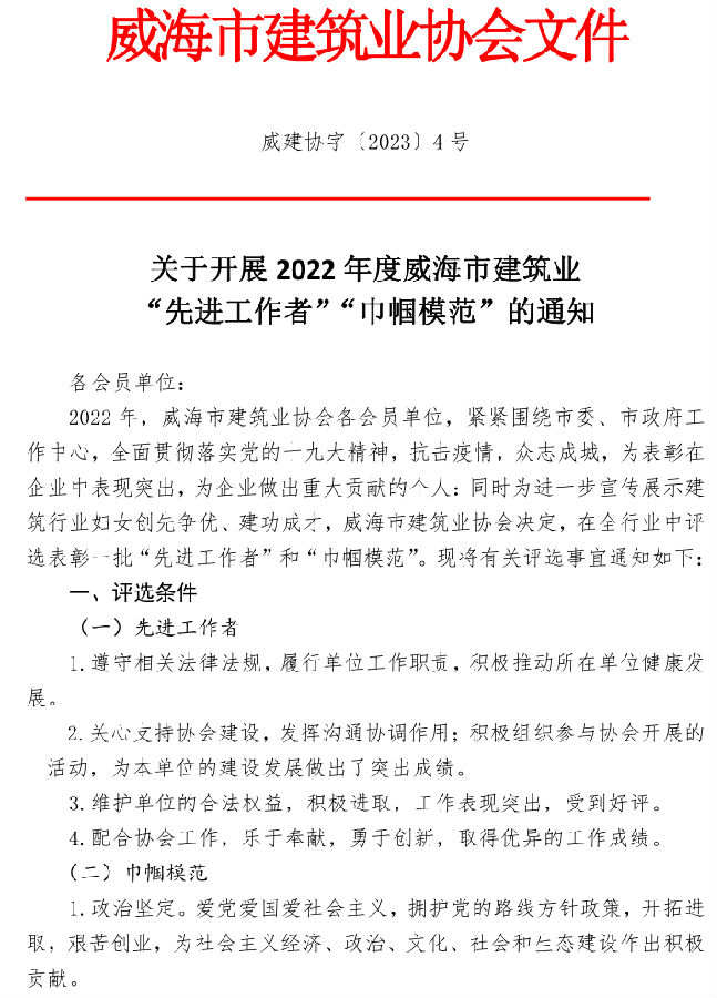 >關于開展2022年度威海市建筑業 “先進工作者”“巾幗模范”的通知